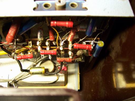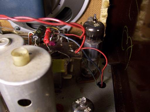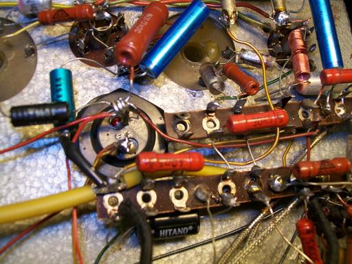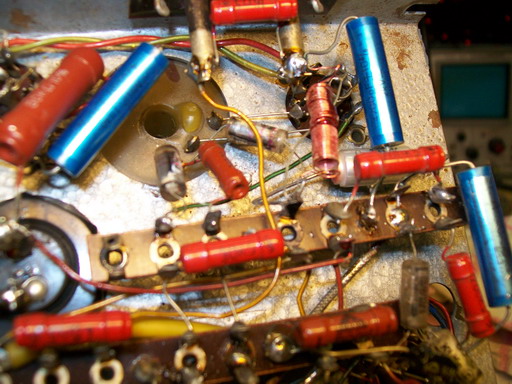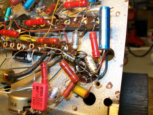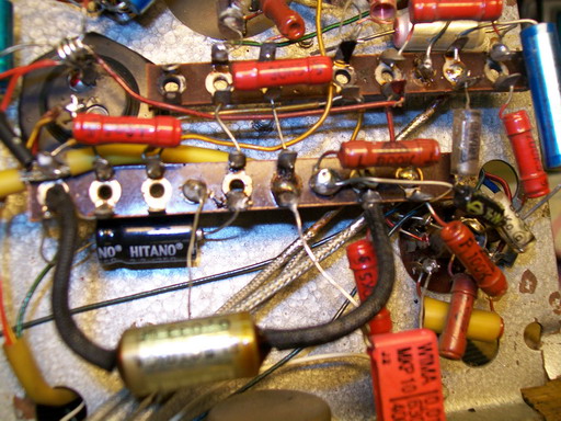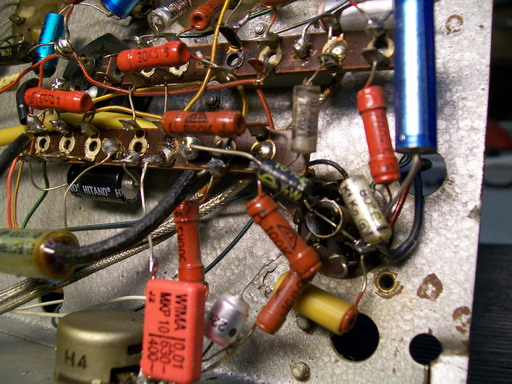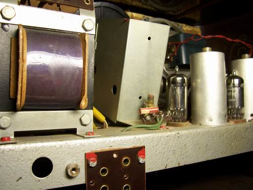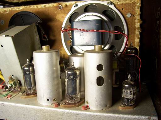 Von Innen gibt es nichts spektakuläres zu berichten. Alles ganz normal und sauber. Auch der Ausgangsübertrager macht noch eine gute Figur. Als einzig technische Besonderheit dürfte die PCL81 gelten. Diese Röhre wurde normalerweise in TV´s verbaut. Hier wird sie jedoch als Endstufe missbraucht. Das klappt aber dank des empfindlichen Lautsprechers gut und sogar recht klangstark! Ich war nun echt zu faul das Chassis nur wegen ein paar Bilder auszubauen. Es gibt nicht besonderes zu berichten. Alle Kondensatoren wurden schon vom Vorbesitzer gewechselt, was soll ich also zeigen? :-) Ein paar Jahre seit meinem letztem Eintrag hier sind nun vergangen. In einem Forum tauchte nun die Frage nach Bildern des Chassis auf. Besonders die um den Bereich der PCL wurden gesucht. Diese liefere ich jetzt also mit ein paar Bildern nach.