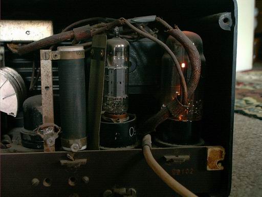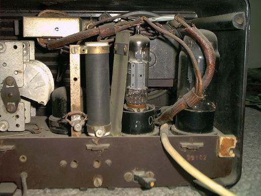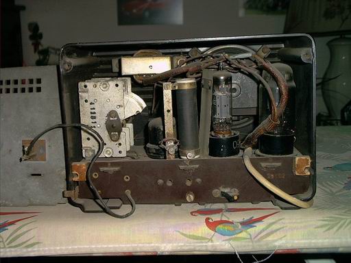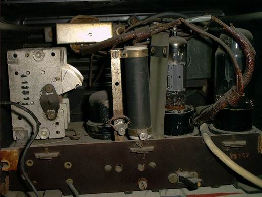 Man muß schon ganz genau hinsehen um das schwache glimmen der Röhren zu bemerken. Hier besonders gut zu erkennen; Der Siebwiderstand und der Drehkondensator. An der Rückwand angeschlossen ist noch ein Kabel für eine Außenringantenne. So, das war das letzte Bild. Sollte jemand ein besonderes Detail vermissen kann er sich gerne bei mir melden. Ich werde es dann extra groß fotografieren und ebenfalls hier einstellen. |